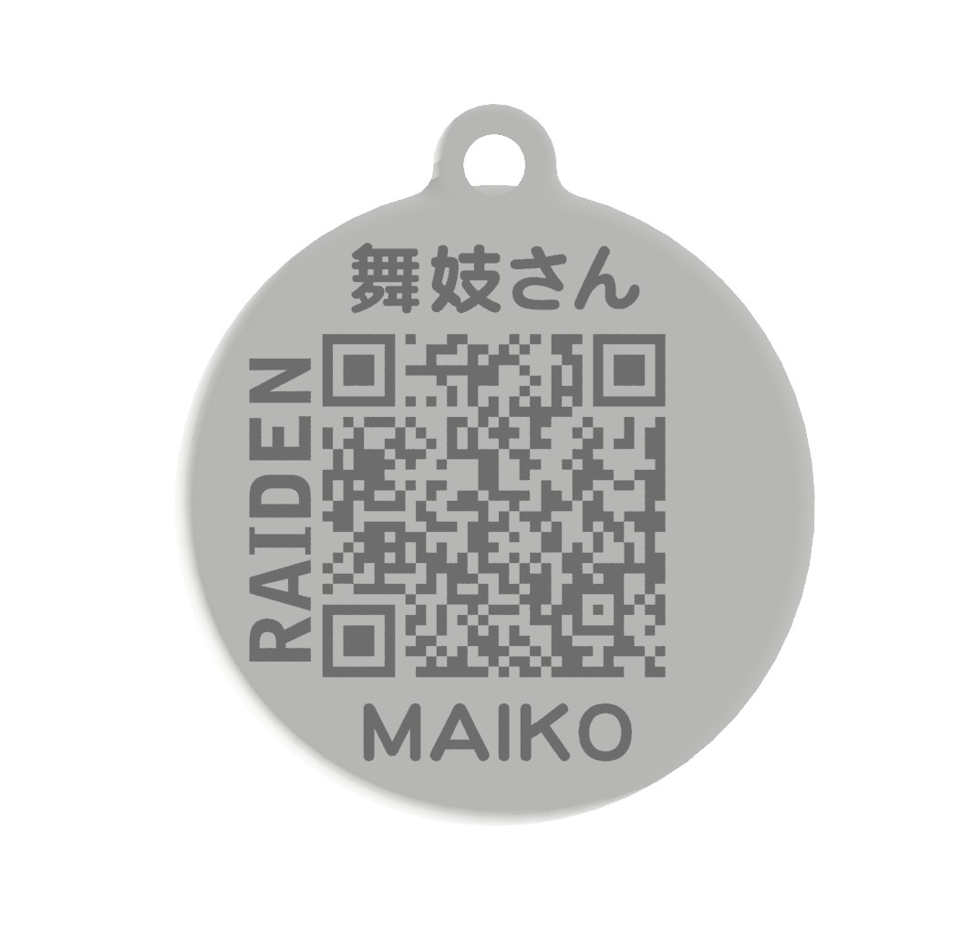 シンプルかつ優美なデザインが特徴で、舞妓さんの持つ華やかさと、裏面の機能的なデザインが絶妙に調和。コンパクトなサイズ感ながらも、しっかりとした存在感を放ちます。ペットタグ、ネームタグ、または単なるお守りとしても最適です。